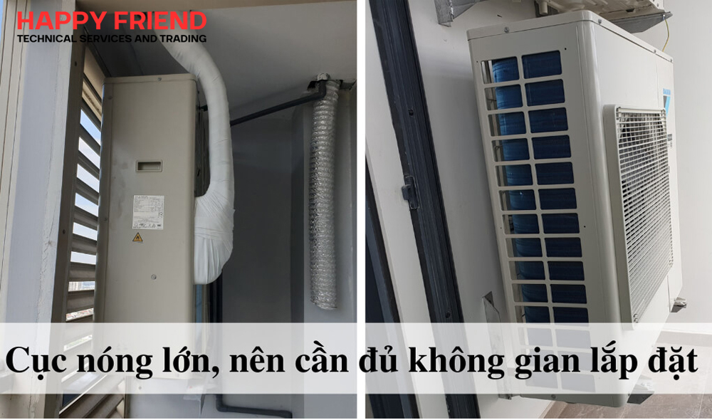 Mặc dù chỉ có một dàn nóng nhưng kích thước của nó tương đối cồng kềnh so với những dàn nóng khác, do đó bạn phải đặt chúng ở khu vực ban công ngoài trời và cố định chắc chắn. Đảm bảo dàn nóng có đủ không gian để tỏa nhiệt dễ dàng. Nếu không tỏa nhiệt được rất có thể gây ra tình trạng điều hòa không mát.